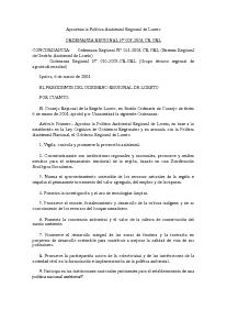 La presente norma aprueba la Política Ambiental Regional de Loreto, en base a lo establecido en la Ley Orgánica de Gobiernos Regionales y en armonía con la Política Ambiental Nacional, el Gobierno Regional de Loreto:
