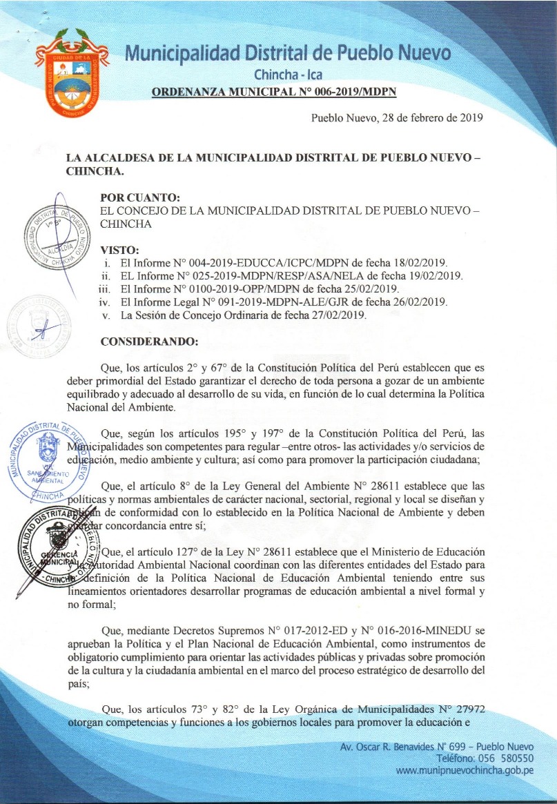 La presente Ordenanza Municipal aprueba el Programa Municipal de Educación, Cultura y Ciudadanía Ambiental de la Municipalidad Distrital de Pueblo Nuevo, distrito de la provincia de Chincha, para el periodo 2019- 2022; con la finalidad de promover la cultura y la educación ambiental para la formación de ciudadanas y ciudadanos ambientalmente responsables e incentivar la participación ciudadana en todos sus niveles.