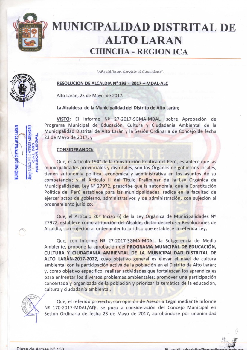 Aprueban Programa Municipal de Educación, Cultura y Ciudadanía Ambiental de la Municipalidad Distrital de Alto Larán para el periodo 2017 -2022