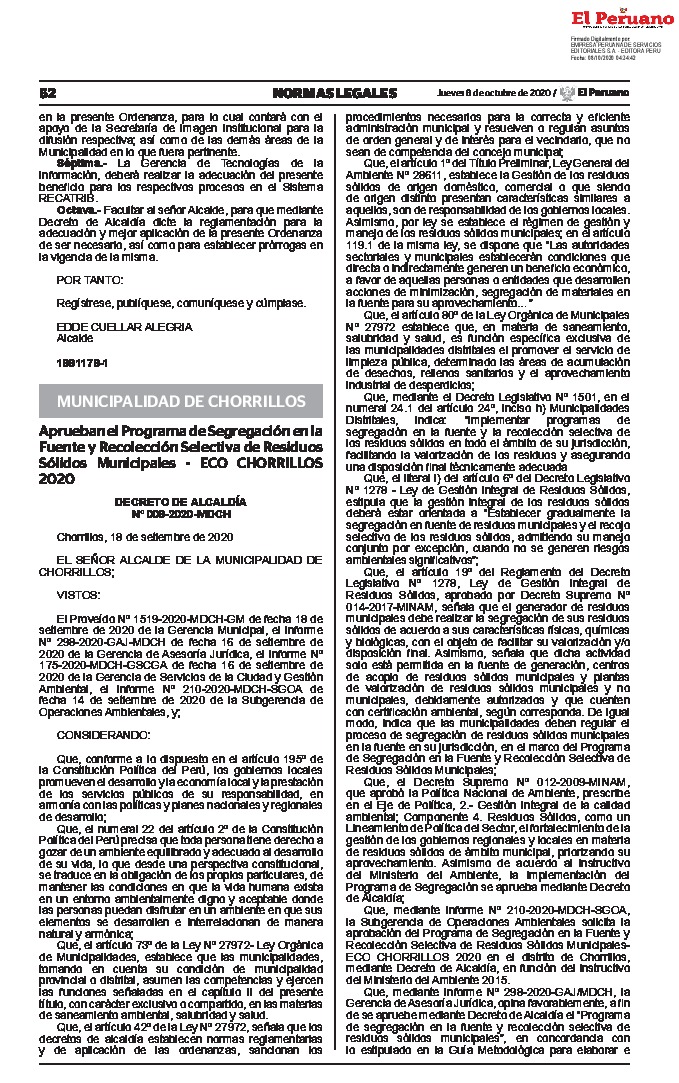 El presente Decreto de Alcaldia aprueba el Programa de Segregación en la Fuente y Recolección Selectiva de Residuos Sólidos Municipales- ECO CHORRILLOS 2020, en el distrito de Chorrillos que se implementará durante los años 2020- 2022 en todo el ámbito del distrito.