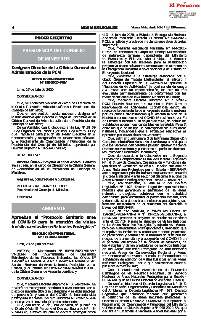 Aprueban el “Protocolo Sanitario ante el COVID-19 para la atención de visitas turísticas en las Áreas Naturales Protegidas”