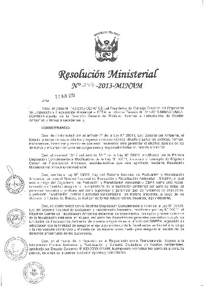 La presente Resolución Ministerial tiene por objeto aprobar el Régimen Común de Fiscalización Ambiental, establecido en el numeral 131.2 del artículo 131° de la Ley N° 28611, Ley General del Ambiente y regulado en la Sétima Disposición Complementaria Final de la Ley N° 29325, Ley del Sistema Nacional de Evaluación y Fiscalización Ambiental (SINEFA), modificada por la Ley 30011, y en el Decreto Legislativo N° 1013, Decreto Legislativo que aprueba la Ley de Creación, Organización y Funciones del Ministerio del Ambiente.
