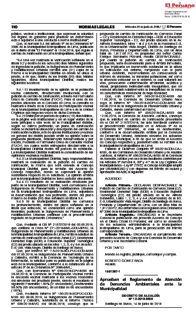 Mediante el presente decreto de alcaldía se aprueba el Reglamento de Atención de Denuncias Ambientales ante la Municipalidad de Santiago de Surco.