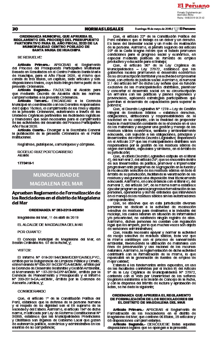 Aprueban Reglamento de Formalización de los Recicladores en el distrito de Magdalena del Mar