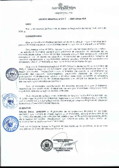 Decreto Regional que aprueba el Reglamento de la Ordenaza Regional N° 027-2008-GRSM/CR, que declara de interes regional y de necesidad pública el desarrollo de la actividad bioenergetica de la Region San Martin y crea el "Programa de Biocombustibles de la Region San Martin - PROBIOSAM"