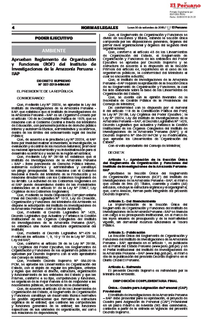 El presente Decreto Supremo aprueba la Sección Única del Reglamento de Organización y Funciones (ROF) del Instituto de Investigaciones de la Amazonía Peruana - IIAP, el mismo que consta de tres (3) Títulos, cuarenta y cuatro (44) artículos, e incluye la estructura orgánica y el organigrama.