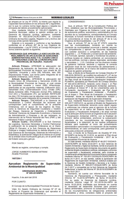 Mediante la presente ordenanza municipal se aprobó el rseglamento de Supervisión Ambiental de la Municipalidad de Huaura, que consta de veintiún (21) artículos y dos (02) Disposiciones Complementarias.