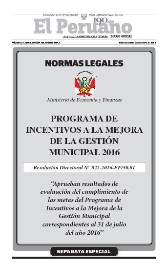 “Aprueban resultados de evaluación del cumplimiento de las metas del Programa de Incentivos a la Mejora de la Gestión Municipal correspondientes al 31 de julio del año 2016”