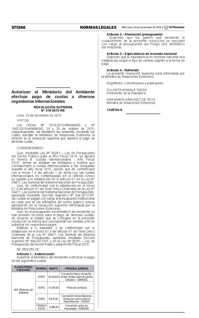 La presente Resolución Suprema autoriza al Ministerio del Ambiente a efectuar el pago de cuotas a las siguientes razones sociales: