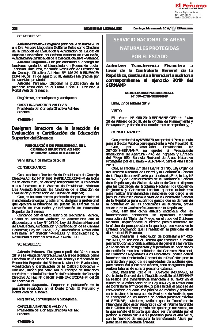 Autorizan Transferencia Financiera a favor de la Contraloría General de la República, destinada a financiar la auditoria correspondiente al ejercicio 2019 del SERNANP