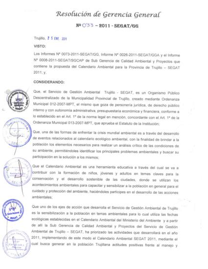 La Resolución de Gerencia General Nº 033-2011-SEGAT/GG aprueba el Calendario Ambiental SEGAT 2011, el cual se encuentra adjuntado por fechas y meses en el presente documento.