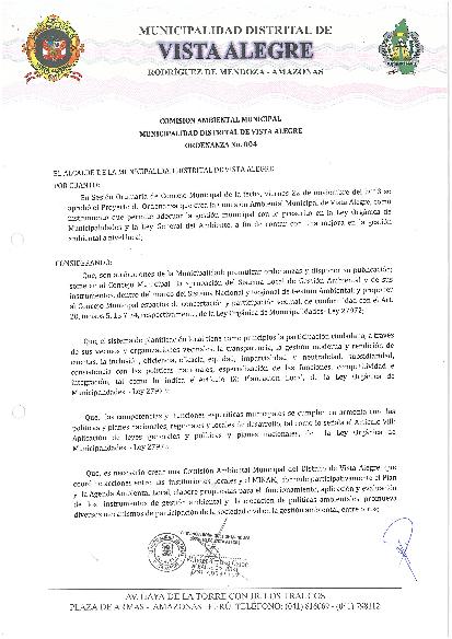 Se aprueba la Ordenanza que crea la Comision Ambiental Municipal de Vista Alegre (CAM), como instrumento que permite adecuar la gestión municipal con el prescrito en la Ley Orgánica de Municipalidades y la Ley General del Ambiente, a fin de contar con una mejora en la gestión ambiental a nivel local.