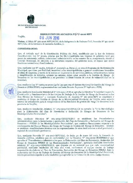 Conformar el Equipo Técnico del Grupo de Trabajo de Gestión del Riesgo de Desastres de la Municipalidad Provincial de Trujillo, el cual esta costituido de la siguiente manera: Gerencia de Planeamiento y Presupuesto (convoca y preside), Subgerencia de Defensa Civil (secretaría técnica), Gerencia de Obras Públicas (Subgerencia de Proyectos), Gerencia de Desarrollo Urbano (Subgerencias de Habilitaciones Urbanas y de Edificaciones), PLANDET, Gerencia de Desarrollo Social y SEGAT.