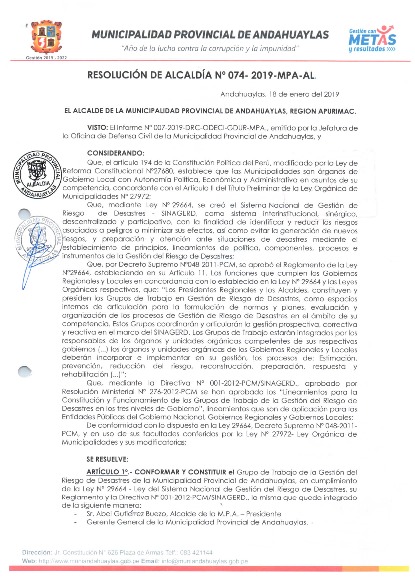 ARTICULO 1º.- CONFORMAR Y CONSTITUIR el grupo de Trabajo de la gestión del Riesgo de Desastres de la Municipalidad de Andahuaylas, en cumplimiento de la Ley Nº 29664 – Ley del Sistema Nacional de Gestión del Riego de Desastres su Reglamento y la Directiva Nº 001-2012-PCM/SINAGERD., la misma que queda integrado de la siguiente manera.