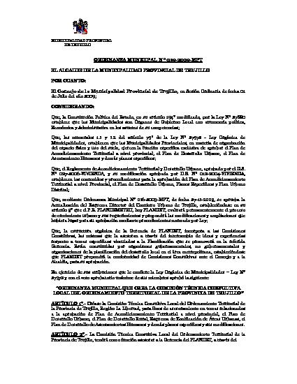 Ordenanza que crea la Comisión Técnica Consultiva Local del Ordenamiento Territorial de la provincia de Trujillo, Región La Libertad, para fines de asesoramiento en temas relacionados a la aprobación de Plan de Acondicionamiento Territorial a nivel provincial, el Plan de Desarrollo Urbano, el Plan de Desarrollo Rural, Esquema de Zonificación de Áreas Urbanas, el Plan de Desarrollo de Asentamientos Humanos y demás planes específicos y sus modificaciones.