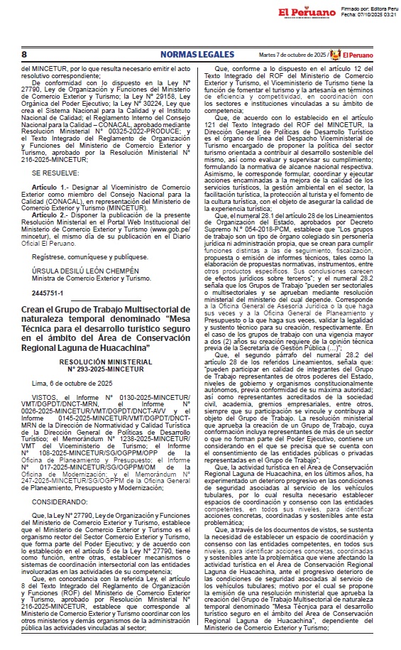 Crean el Grupo de Trabajo Multisectorial de naturaleza temporal denominado “Mesa Técnica para el desarrollo turístico seguro en el ámbito del Área de Conservación Regional Laguna de Huacachina”