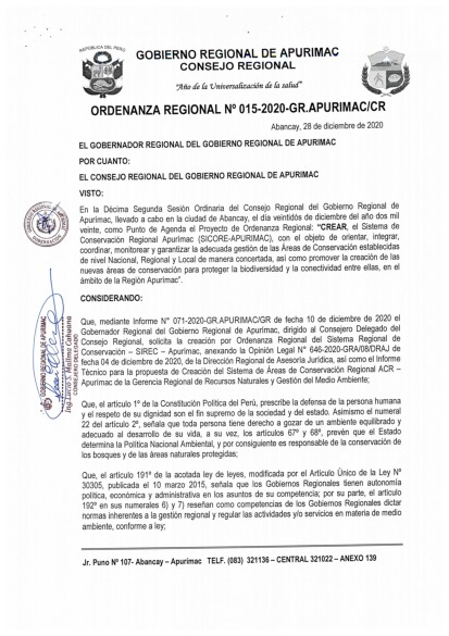 HA APROBADO LA SIGUIENTE ORDENANZA REGIONAL ARTICULO PRIMERO. – CREAR, el Sistema de Conservación Regional Apurímac (SICORE-APURIMAC), con el objeto de orientar, integrar, coordinar, monitorear y garantizar la adecuada gestión de las Áreas de Conservación establecidas de nivel Nacional, Regional y Local de manera concertada, así como promover la creación de las nuevas áreas