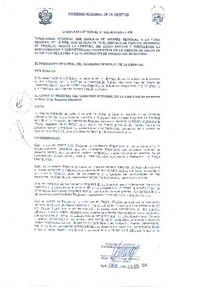 ORDENANZA REGIONAL QUE DECLARA DE INTERES REGIONAL A LA FERIA REGIONAL DE LA PIÑA, QUE SE REALIZA EN EL DISTRITO DE POROTO, PROVINCIA DE TRUJILLO, REGION LA LIBERTAD. ASI COMO APOYAR Y FORTALECER LA SOSTENIBILIDAD Y LA COMPETITIVIDAD PRODUCTIVA DE LA CADENA DE VALOR EN EL CULTIVO DE LA PIÑA Y LA ELABORACION DE PRODUCTOS DERIVADOS