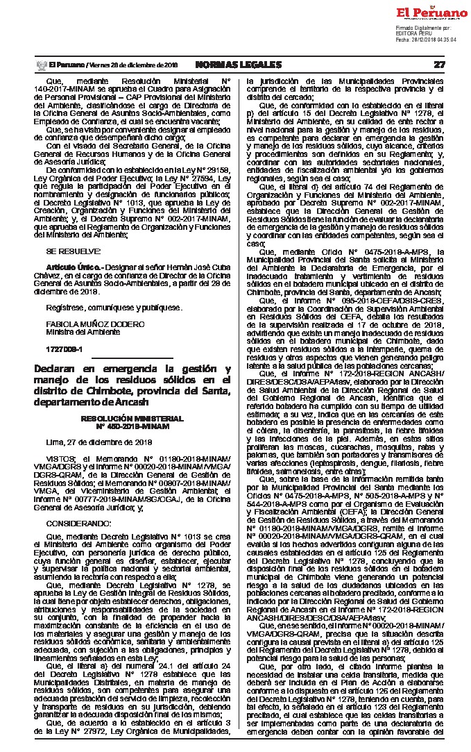 Declaran en emergencia la gestión y manejo de los residuos sólidos en el distrito de Chimbote, provincia del Santa, departamento de Ancash
