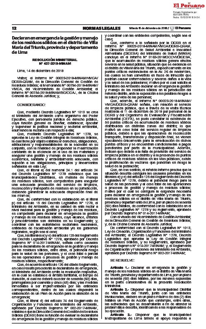 Declarar en emergencia la gestión y manejo de los residuos sólidos en el distrito de Villa María de Triunfo, provincia y departamento de Lima, por un plazo de sesenta (60) días hábiles. Asimismo, dispone que la Municipalidad Distrital de Villa María del Triunfo, junto con las entidades involucradas, elabore en un plazo máximo de dos (2) días hábiles un Plan de Acción que contemple, entre otras, las actividades que se desarrollarán a fin de atender la problemática descrita, identificando a los responsables de su ejecución.