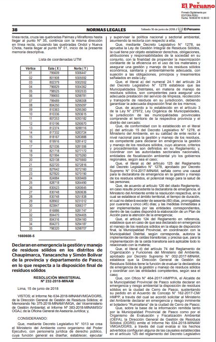 Mediante la presente resolución ministerial se declara en emergencia la gestión y manejo de residuos sólidos en los distritos de Chaupimarca, Yanacancha y Simón Bolívar de la provincia y departamento de Pasco, en lo que respecta a la disposición final de residuos sólidos, en lo que respecta a la disposición final de residuos sólidos, por un plazo de sesenta (60) días calendario, por las razones expuestas en la parte considerativa de la presente Resolución Ministerial.