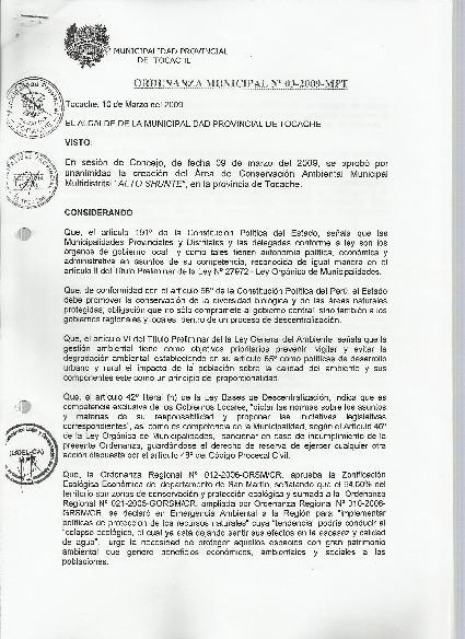 Ordenanza Municipal que declara de Necesidad y utilidad Publica el Establecimiento del Área de Conservación Ambiental Municipal Multidistrital "Alto Shunte"