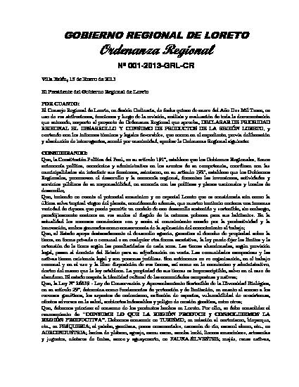 DECLARAR DE PRIORIDAD REGIONAL, EL DESARROLLO Y CONSUMO DE PRODUCTOS DE LA REGIÓN LORETO, conservando su biodiversidad y riqueza ecológica, así como el respeto a los valores culturales y sociales, asociados a su situación de centro de origen y domesticación de cultivos regionales, desarrollándose una Gestión sostenible de sus Recursos Naturales y del Medio Ambiente.