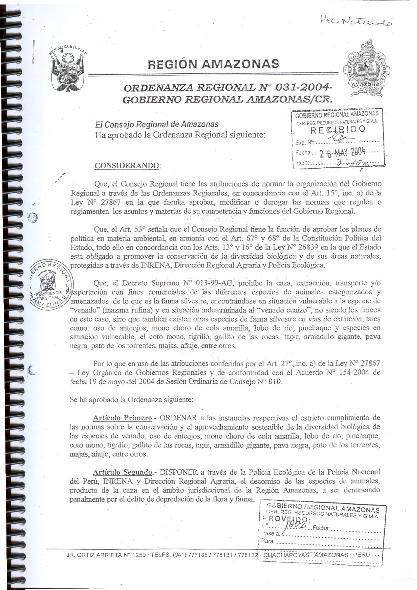 Ordenar a la instancias respectivas el estricto cumplimiento de las normas sobre Conservacion y el Aprovechamiento sostenible del la diversidad biologica de las especies de venado, oso de anteojo, mono choro de cola amarilla, lobo de rio, pinchaque, coto mono, tigrillo, gallito de las rocas, tapir entre otros.