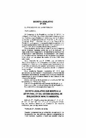 Decreto Legislativo que modifica la Ley 27446, ley del Sistema Nacional de Evaluación de Impacto Ambiental en los artículos 2,3, 4, 5, 6, 10,11,12,15,16,17 y 18 de la mencionada ley.