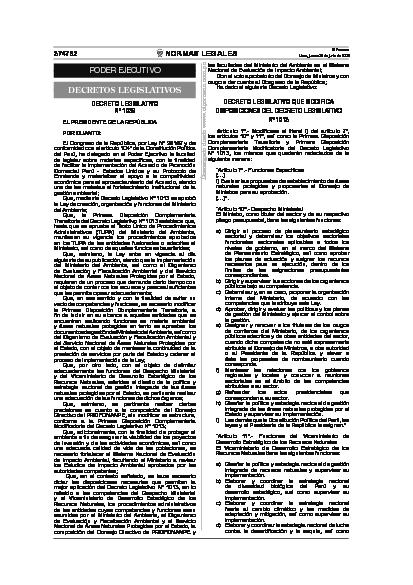 En el presente decreto legislativo se modifica el literal del artículo 7, los artículos 10 y 11, así como la Primera Disposición Complementaria Transitoria y Primera Disposición Complementaria Modificatoria del Decreto Legislativo N° 1013, que aprobó la creación del Ministerio del Ambiente.