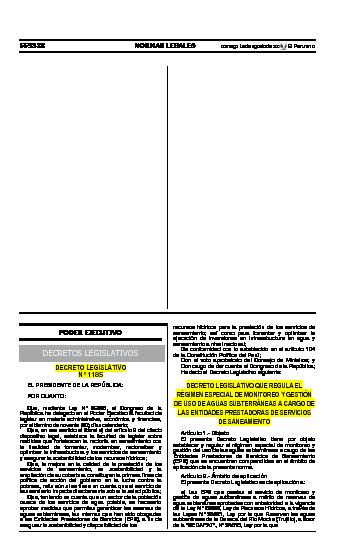 El presente Decreto Legislativo tiene por objeto establecer y regular el régimen especial de monitoreo y gestión del uso de las aguas subterráneas a cargo de las Entidades Prestadoras de Servicios de Saneamiento (EPS) que se encuentren comprendidas en el ámbito de aplicación de la presente norma.