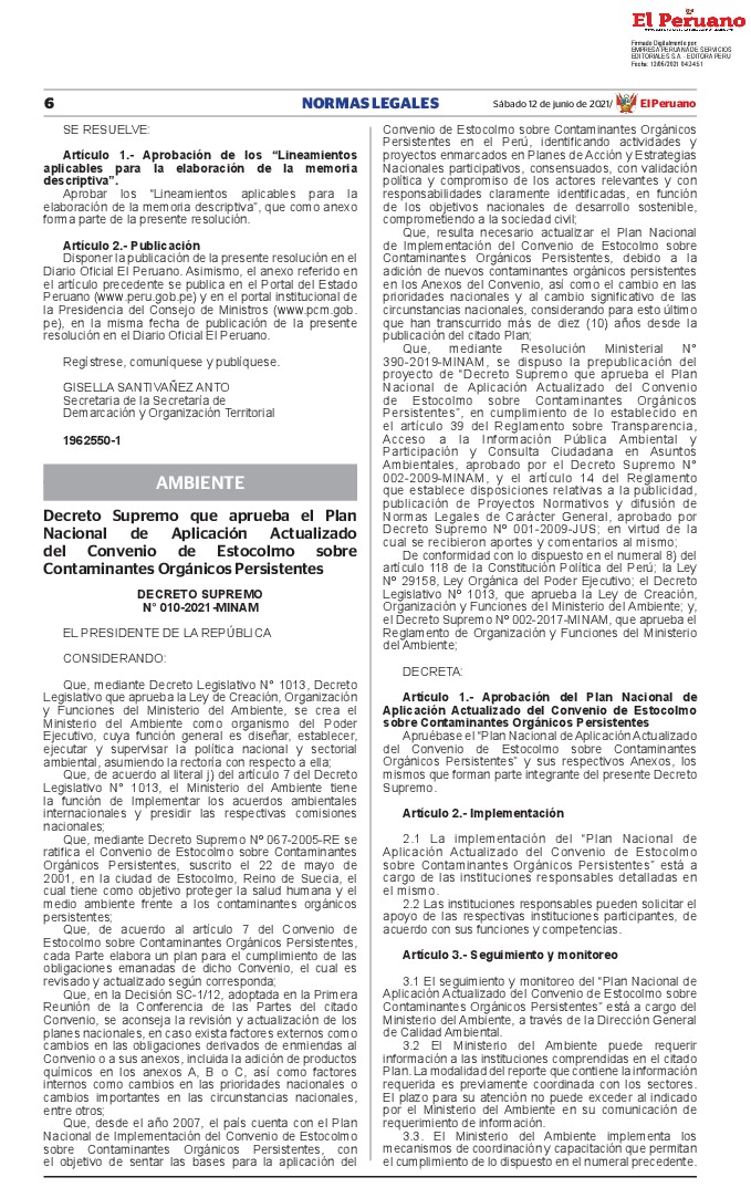 A través del presente Decreto Supremo se aprueba el “Plan Nacional de Aplicación Actualizado del Convenio de Estocolmo sobre Contaminantes Orgánicos Persistentes” y sus respectivos Anexos, asimimo establece que el el seguimiento y monitoreo está a cargo del Ministerio del Ambiente, a través de la Dirección General de Calidad Ambiental.