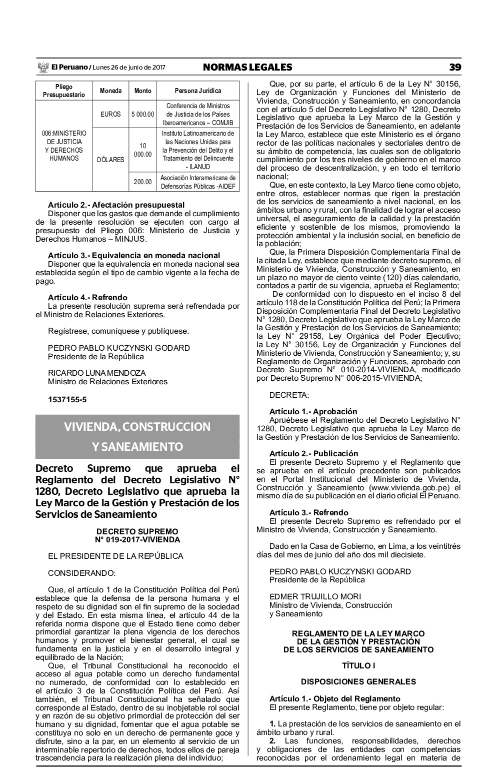 Decreto Supremo que aprueba el Reglamento del Decreto Legislativo N° 1280, Decreto Legislativo que aprueba la Ley Marco de la Gestión y Prestación de los Servicios de Saneamiento
