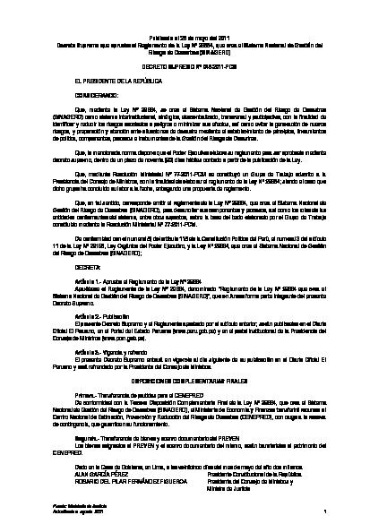 Mediante este Decreto Supremo se aprueba el Reglamento de la Ley Nº 29664, denominado “Reglamento de la Ley Nº 29664 que crea el Sistema Nacional de Gestión del Riesgo de Desastres (SINAGERD)”, que en Anexo forma parte integrante del presente Decreto Supremo.