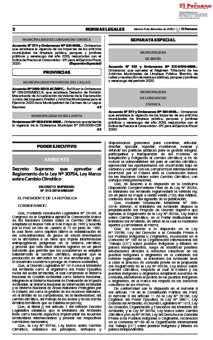 Decreto Supremo que aprueba el Reglamento de la Ley Nº 30754, Ley Marco sobre Cambio Climático