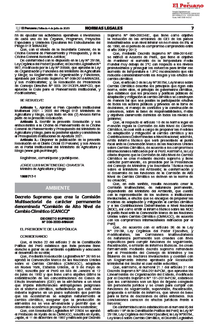 Decreto Supremo que crea la Comisión Multisectorial de carácter permanente denominada “Comisión de Alto Nivel de Cambio Climático (CANCC)”