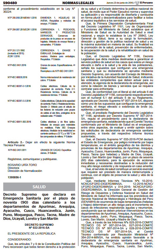 Declaratoria de emergencia sanitaria Declárese en Emergencia Sanitaria, por el plazo de noventa (90) días calendario, a los departamentos de Apurímac, Arequipa, Ayacucho, Cusco, Huancavelica, Junín, Puno, Moquegua, Pasco, Tacna, Loreto, San Martín, Ucayali y Madre de Dios, por las razones expuestas en la parte considerativa del presente Decreto Supremo.