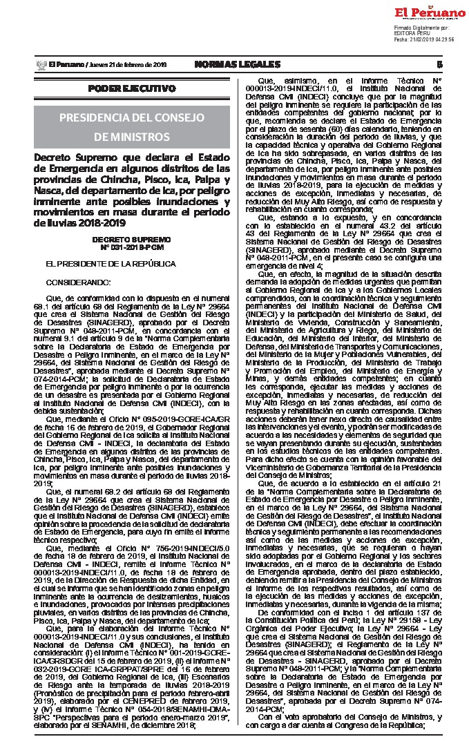 Decreto declara el Estado de Emergencia en algunos distritos de las provincias de Chincha, Pisco, Ica, Palpa y Nasca, del departamento de Ica, por el plazo de sesenta (60) días calendario, por peligro inminente ante posibles inundaciones y movimientos en masa durante el periodo de lluvias 2018-2019, para la ejecución de acciones, inmediatas y necesarias, destinadas a la reducción del muy Alto Riesgo existente, así como de respuesta y rehabilitación encuanto corresponda.