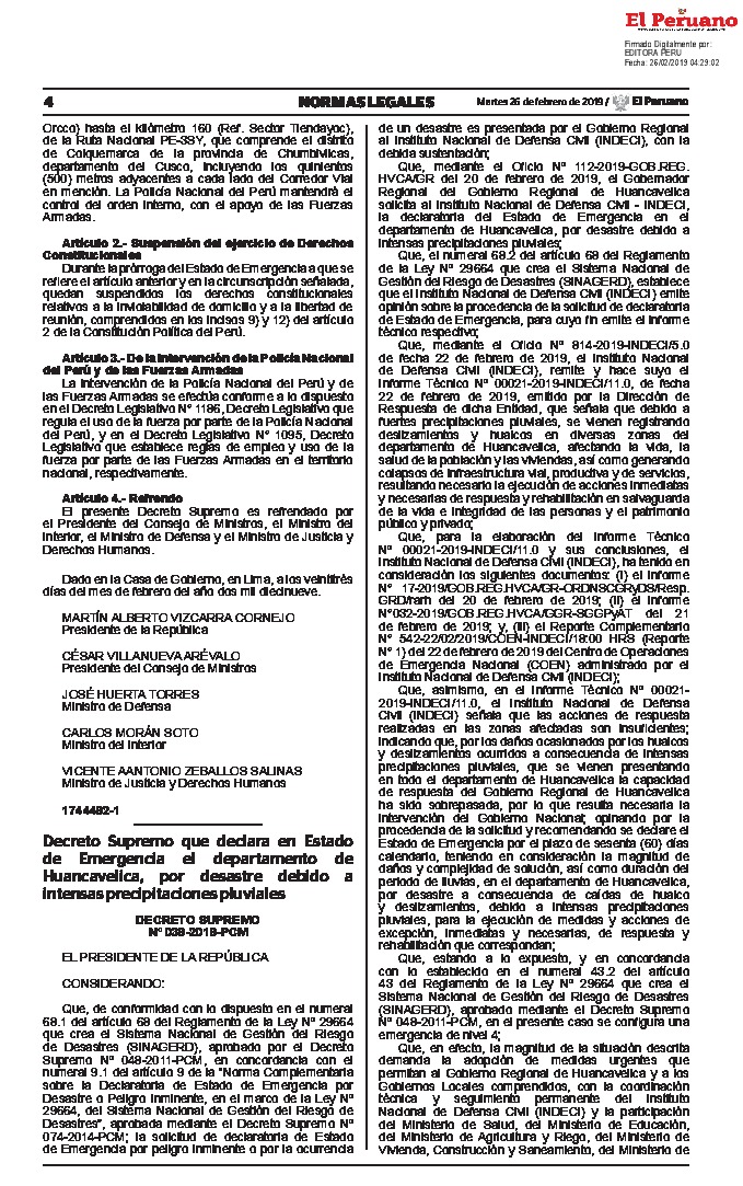Decreto declara en Estado de Emergencia el departamento de Huancavelica, por el plazo de sesenta (60) días calendario, por desastre debido a intensas precipitaciones pluviales, para la ejecución de las medidas y acciones de excepción, inmediatas y necesarias, de respuesta y rehabilitación que correspondan.