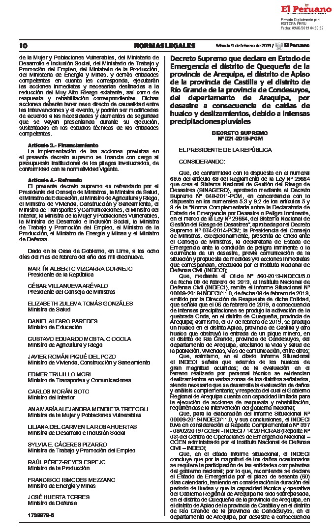 El siguiente decreto declara el estado de emergencia en el distrito de Quequeña de la provincia de Arequipa, en el distrito de Aplao de la provincia de Castilla y en el distrito de Río Grande de la provincia de Condesuyos, del departamento de Arequipa, por el plazo de sesenta (60) días calendario, por desastre a consecuencia de caídas de huaico y deslizamientos, debido a intensas precipitaciones pluviales, para la ejecución de medidas y acciones de excepción, inmediatas y necesarias, de respuesta y rehabilitación en las zonas afectadas, que corresponda.