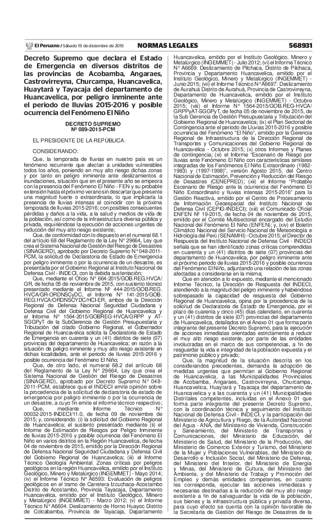 Decreto Supremo que declara el Estado de Emergencia en diversos distritos de las provincias de Acobamba, Angaraes, Castrovirreyna, Churcampa, Huancavelica, Huaytará y Tayacaja del departamento de Huancavelica, por peligro inminente ante el periodo de lluvias 2015-2016 y posible ocurrencia del Fenómeno El Niño.