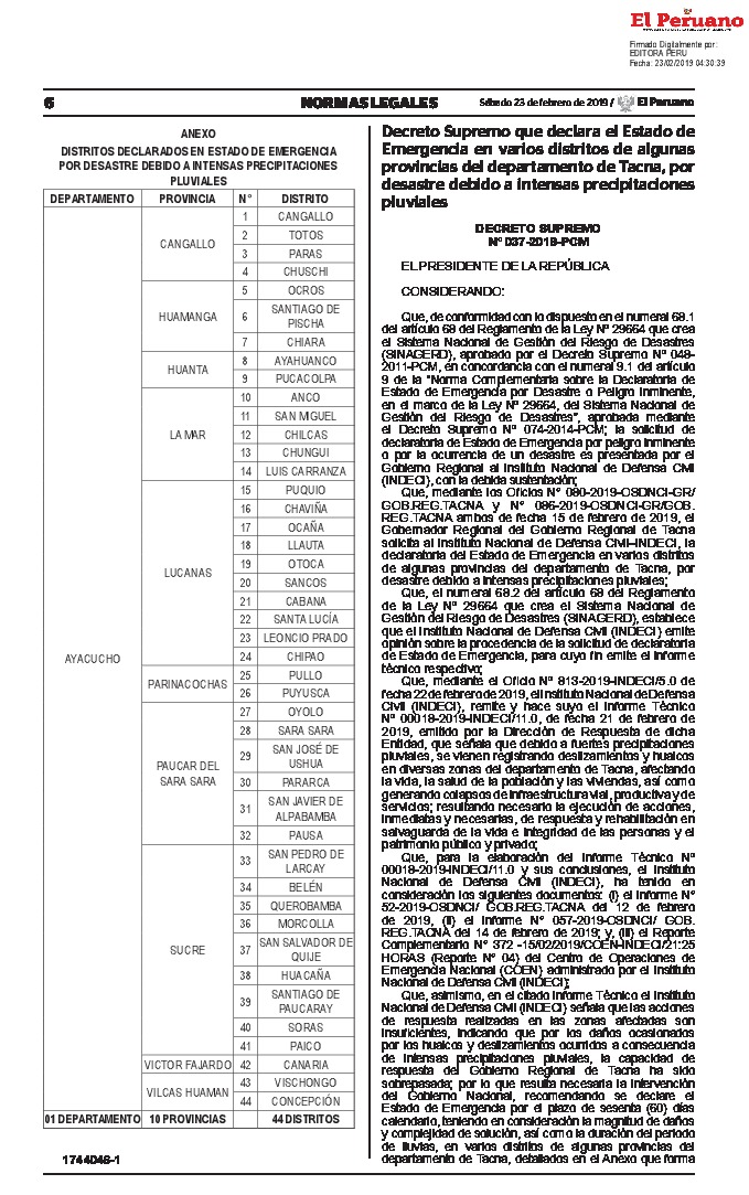 Decreto declara el Estado de Emergencia en varios distritos de algunas provincias del departamento de Tacna, por el plazo de sesenta (60) días calendario, por desastre debido a intensas precipitaciones pluviales, para la ejecución de las medidas y acciones de excepción, inmediatas y necesarias, de respuesta y rehabilitación que correspondan.