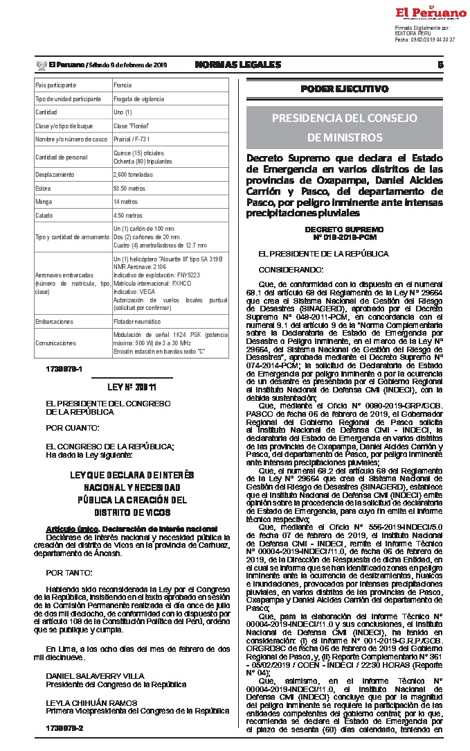 Decreto Supremo que declara el Estado de Emergencia en varios distritos de las provincias de Oxapampa, Daniel Alcides Carrión y Pasco, del departamento de Pasco, por peligro inminente ante intensas precipitaciones pluviales