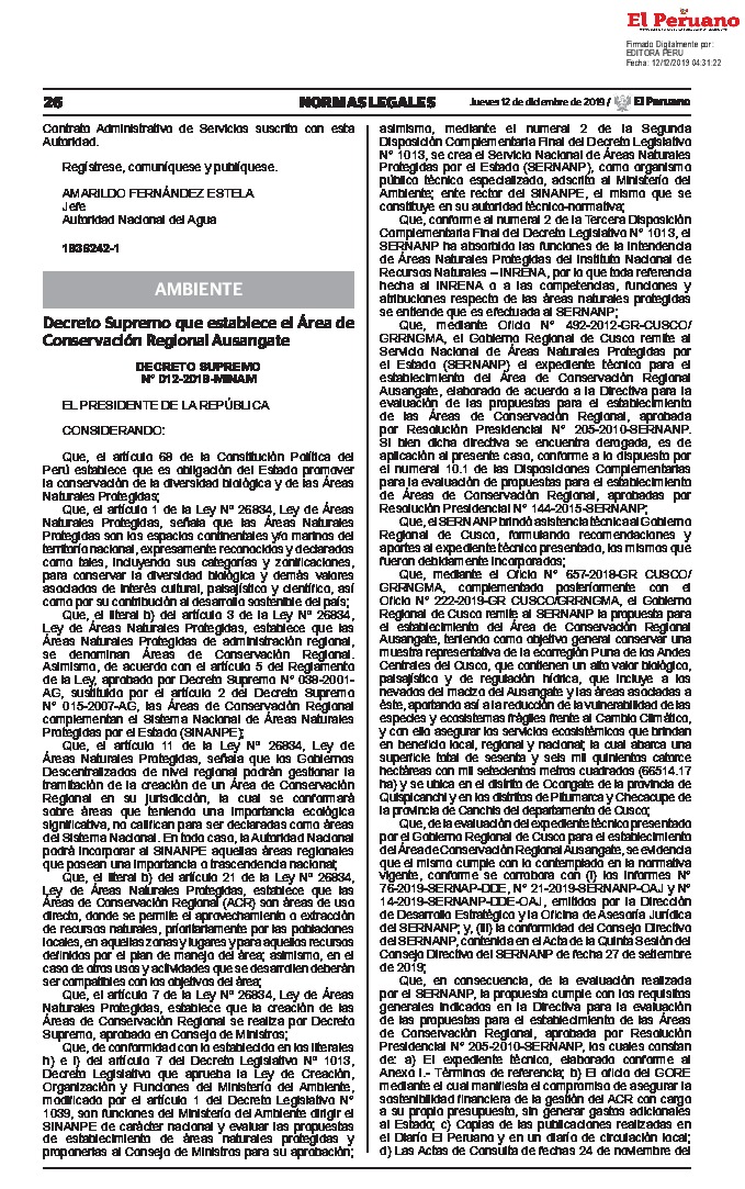 Decreto Supremo que establece el Área de Conservación Regional Ausangate