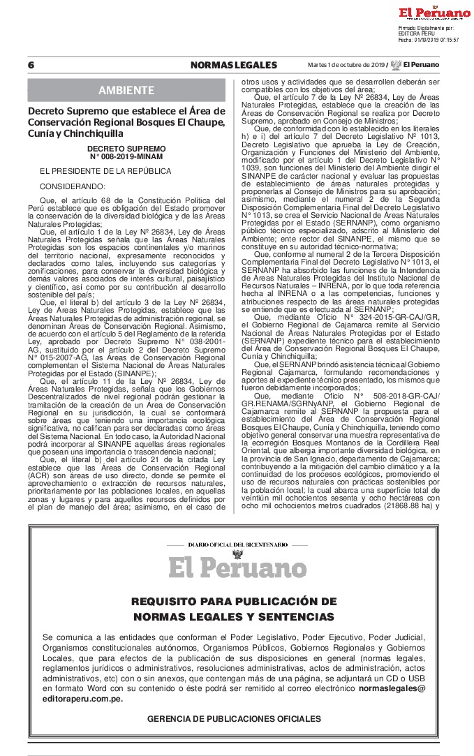 Decreto Supremo que establece el Área de Conservación Regional Bosques El Chaupe, Cunía y Chinchiquilla