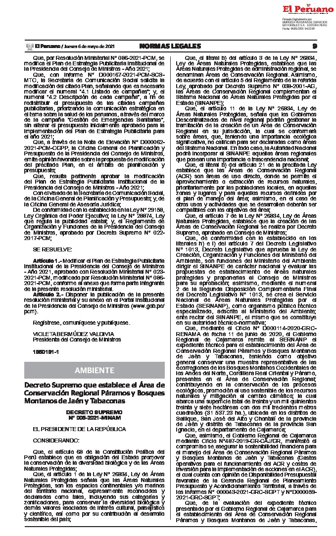 Decreto Supremo que establece el Área de Conservación Regional Páramos y Bosques Montanos de Jaén y Tabaconas