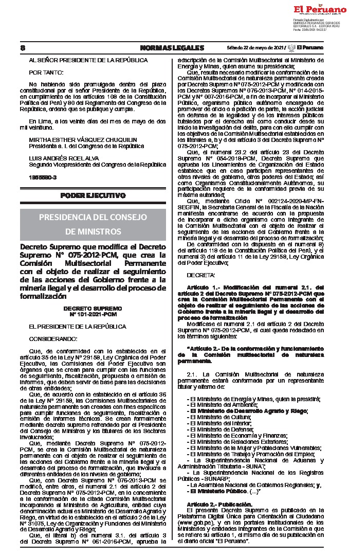 A través del presente Decreto Supremo se modifica el numeral 2.1. del artículo 2 del Decreto Supremo Nº 075-2012-PCM que crea la Comisión Multisectorial Permanente con el objeto de realizar el seguimiento de las acciones de Gobierno frente a la minería ilegal y el desarrollo del proceso de formalización.