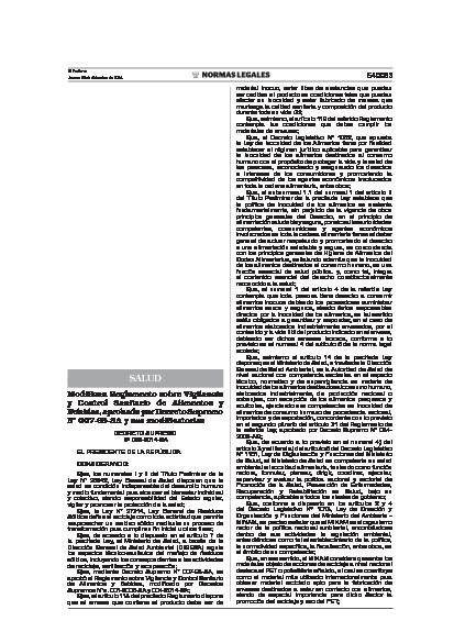 Decreto Supremo que modifica el Reglamento sobre Vigilancia y Control Sanitario de Alimentos y Bebidas, aprobado por Decreto Supremo N° 007-98-SA y sus modificatorias.