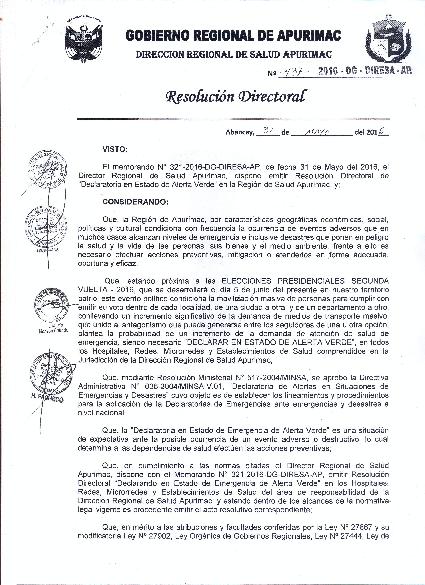 “DECLARAR EN ESTADO DE ALERTA VERDE” a partir de 03 al 07 de junio del 2016, en los hospitales, redes, Micro redes Establecimientos de Salud del área de respetabilidad de la Dirección Regional de Salud Apurímac por las consideraciones expuestas en la presente Resolución Directoral
