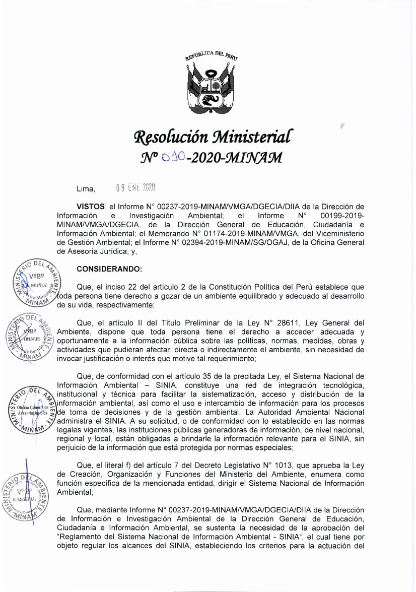 El Reglamento del Sistema Nacional de Información Ambiental - SINIA, tiene por objeto regular los alcances del SINIA, estableciendo los criterios para la actuación del Ministerio del Ambiente y de las demás entidades públicas con competencias ambientales que generan o poseen información ambiental.